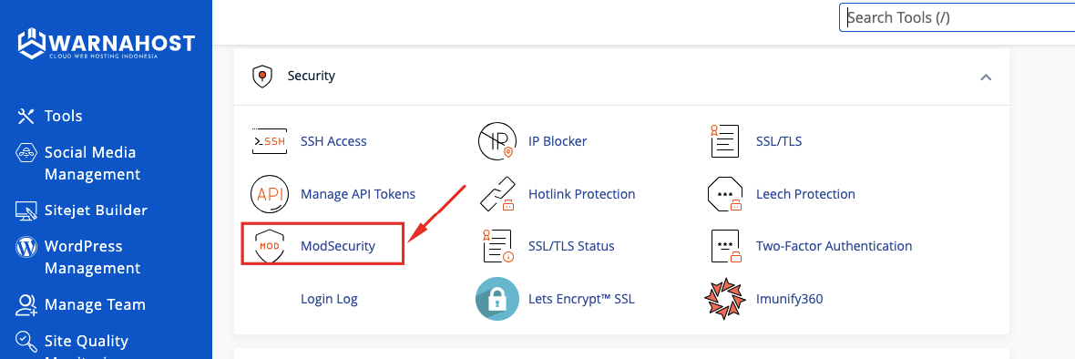 2. Cari Menu Security: Gulir ke bawah hingga menemukan kolom Security, lalu klik ikon ModSecurity.