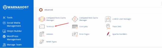 1. Pertama, masuk ke akun cPanel Anda, lalu pergi ke bagian "Advanced" dan klik Terminal. Anda mungkin akan melihat peringatan, baca baik-baik dan klik "Saya Memahami dan ingin melanjutkan" jika Anda setuju.