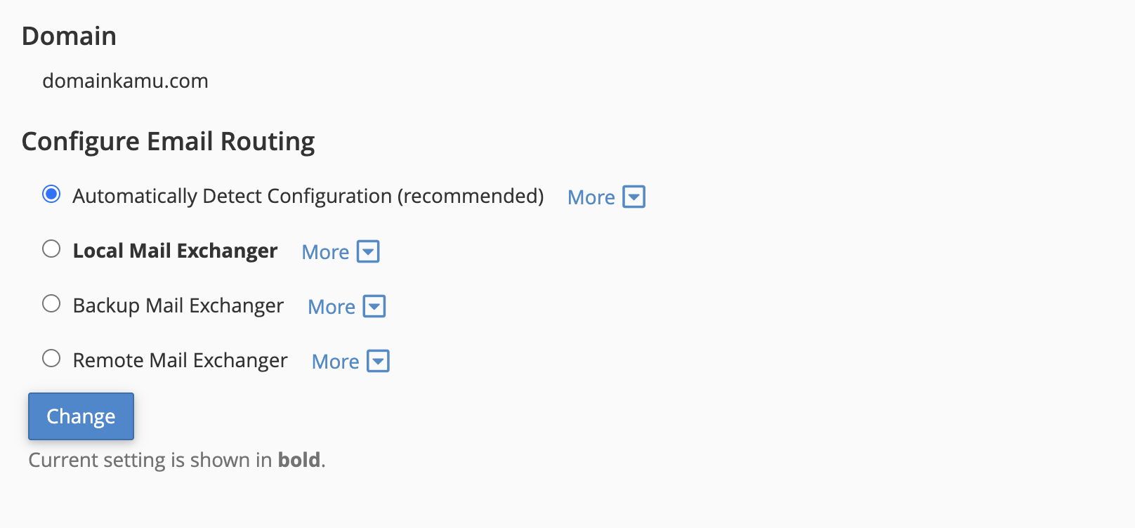 - Local Mail Exchanger: Pilih ini jika Anda ingin semua email untuk domain Anda diproses oleh server mail cPanel.